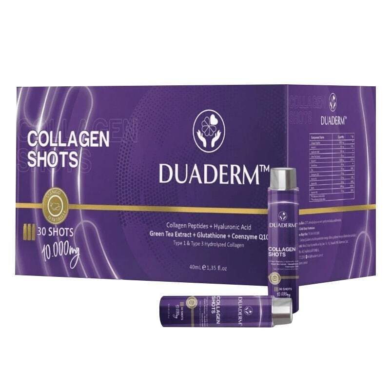 Ürün Adı: Duaderm Collagen Shots Ürün Markası: DuadermÜrün Boyutu: 40 ml x 30 AdetÖzet Bilgi: Tip 1-3 KolajenKullanım Şekli: